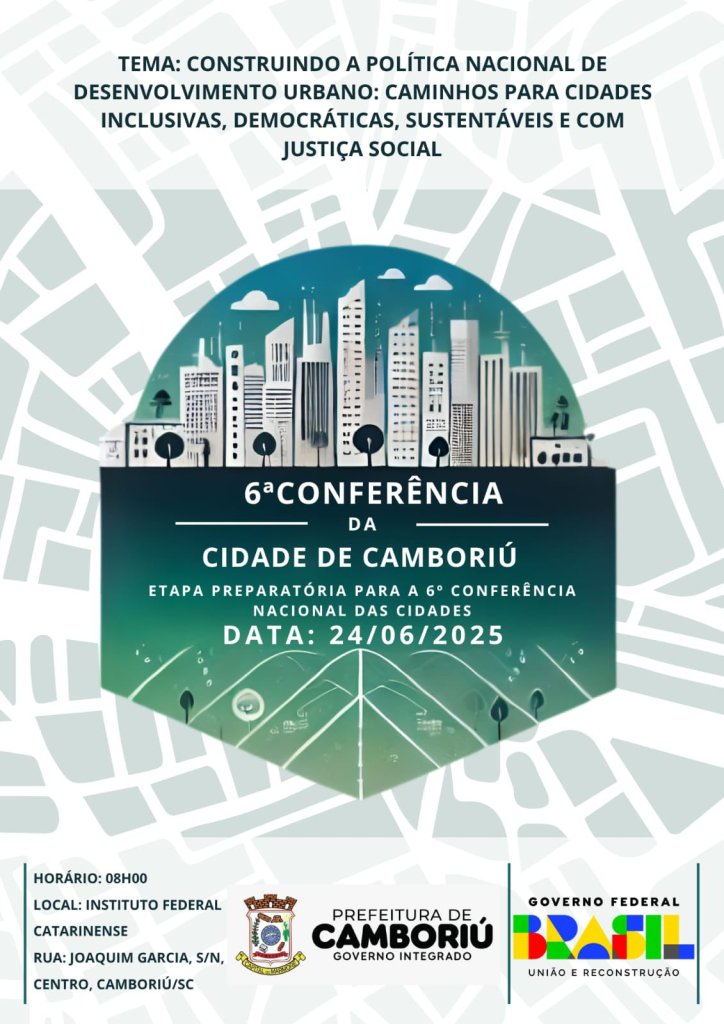 _A Prefeitura de Camboriú realiza no dia 24 de junho de 2025, a 6ª Conferência da Cidade, etapa preparatória para a Conferência Nacional das Cidades. O evento será realizado a partir das 8h, no auditório do Instituto Federal Catarinense (IFC) Rua Joaquim Garcia, s/n – Centro_