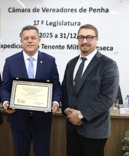 Em sessão solene da Câmara de Vereadores realizada na noite desta segunda-feira (14), o deputado estadual Ivan Naatz (PL), recebeu o título de Cidadão Honorário do Município de Penha, no Litoral Norte. A proposta foi do vereador Élio Quintino da Silva Júnior (PRD), o Élinho, que teve o apoio unânime dos 13 vereadores do legislativo municipal no reconhecimento aos serviços prestados pelo deputado a diversos setores de atividade do município, desde o início de seu mandato no parlamento estadual.