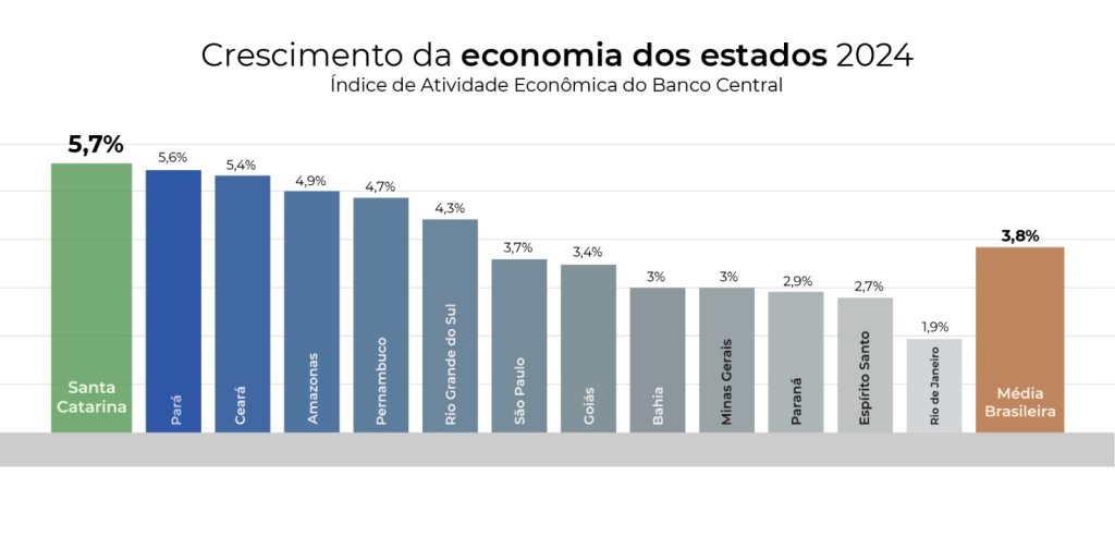 A economia de Santa Catarina cresceu 5,7% em 2024 na comparação com o ano anterior, percentual que coloca o estado com o maior crescimento do país no ranking nacional. O desempenho positivo catarinense é puxado principalmente pelo setor industrial e também pelos bons resultados dos setores do comércio e serviços. O dado é calculado pelo Índice de Atividade Econômica do Banco Central (IBCR) e funciona como uma estimativa do Produto Interno Bruto (PIB).
