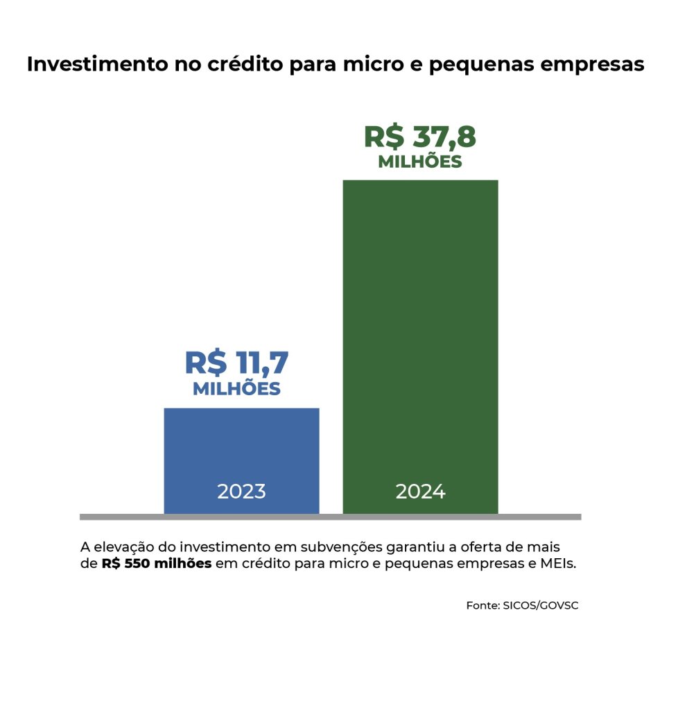 Em 2024, o Governo de Santa Catarina triplicou o investimento destinado a subsidiar operações de crédito para micro e pequenas empresas do estado. Enquanto em 2023 foram aplicados R$ 11,7 milhões para esta finalidade, no ano passado o valor saltou para R$ 37,8 milhões. O fomento aos micro e pequenos negócios e MEIs busca incentivar o empreendedorismo em Santa Catarina e garantir a geração de mais emprego e renda.