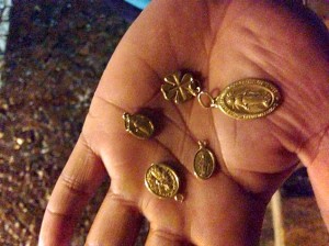Cinco medalhinhas que pertenceram ao ex-governador Eduardo Campos, foram encontradas em Santos no final da tarde de sábado (16) em Santos. A descoberta foi feito pelo pedreiro Alex estevão, que é funcionário da prefeitura de Santos, que integrou uma equipe especialmente para ajudar nas buscas de partes do avião e dos corpos das vitimas.
