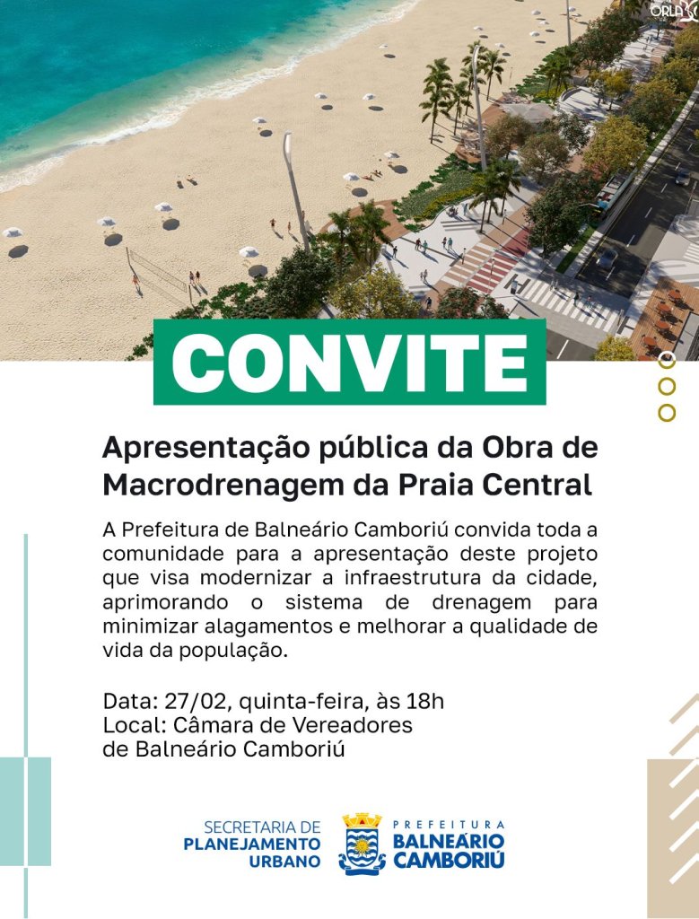 A Prefeitura de Balneário Camboriú fará, nesta quinta-feira (27), a apresentação pública da obra de macrodrenagem da Praia Central. O projeto, que visa modernizar o sistema de drenagem da cidade para minimizar alagamentos, será apresentado a partir das 18h na Câmara de Vereadores. O evento é aberto ao público.