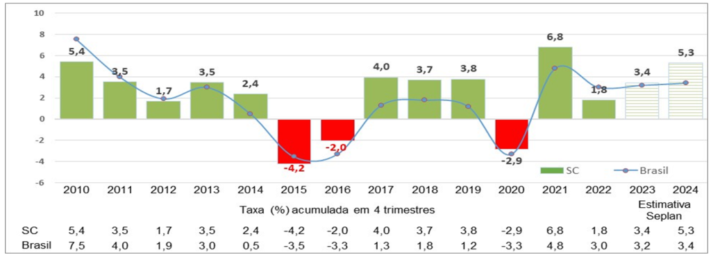 Estimativa do Produto Interno Bruto (PIB) de Santa Catarina aponta crescimento de 5,3%, em 2024, comparado ao ano anterior. Esse desempenho supera a estimativa do crescimento médio nacional, de 3,4% no mesmo período. As projeções sobre o PIB catarinense são feitas pela Diretoria de Políticas Públicas da Secretaria de Estado do Planejamento (Seplan).