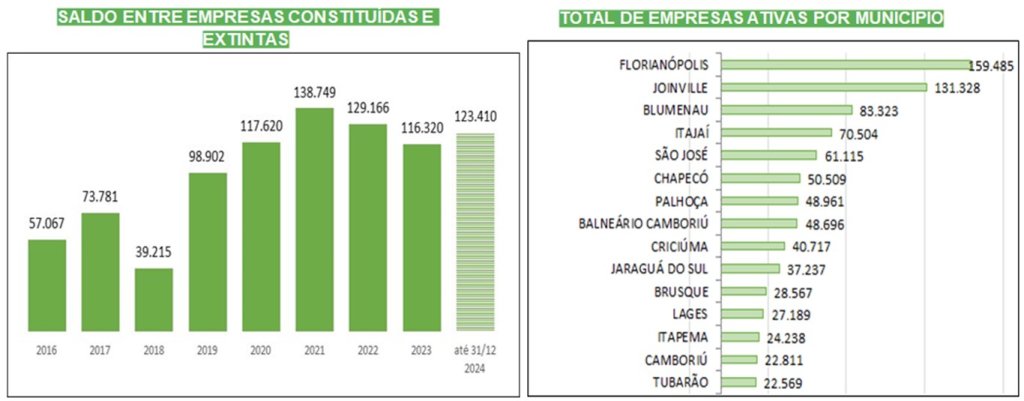 Em relação ao total de empresas ativas por município, as 15 maiores concentrações estão em Florianópolis, Joinville, Blumenau, Itajaí, São José, Chapecó, Palhoça, Balneário Camboriú, Criciúma, Jaraguá do Sul, Brusque, Lages, Itapema, Camboriú e Tubarão.