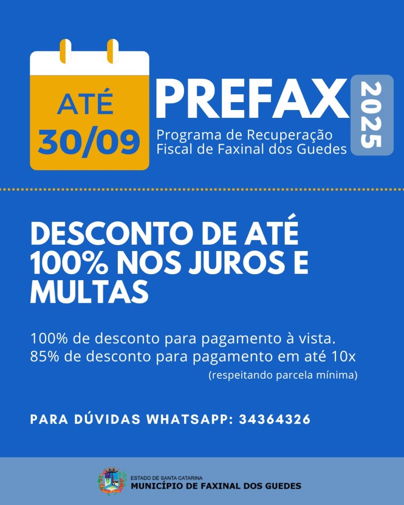 A Prefeitura de Faxinal dos Guedes anunciou nesta semana o lançamento do *PREFAX 2025* – Programa de Recuperação Fiscal do Município, uma iniciativa voltada à regularização de débitos tributários de contribuintes com o município. O programa já está em vigor e oferece condições especiais para quem deseja quitar ou parcelar suas dívidas.