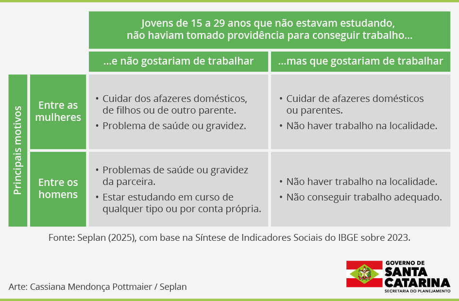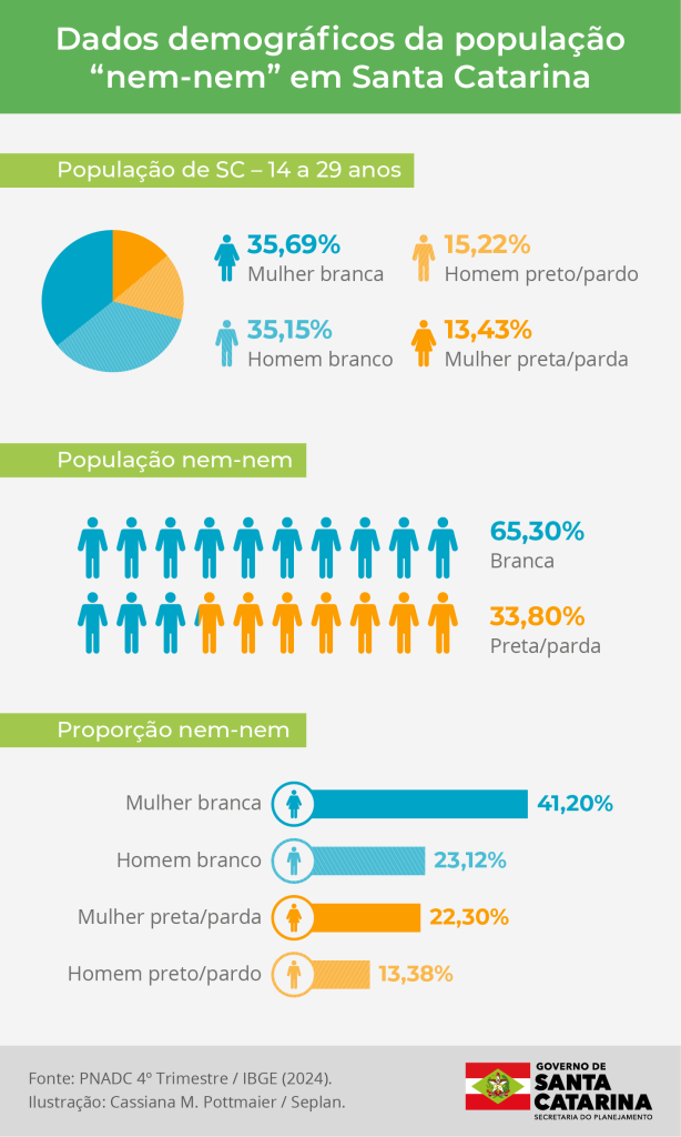 Os dados sobre os “nem-nem” em Santa Catarina são inéditos e foram gerados pela Diretoria de Políticas Públicas da Secretaria de Estado do Planejamento (Seplan). Para tanto, foram feitos cruzamentos e análises pormenorizadas dos resultados da Pesquisa Nacional por Amostra de Domicílios Contínua (PNAD Contínua). O estudo tem como base os dados divulgados pelo IBGE em fevereiro de 2025.