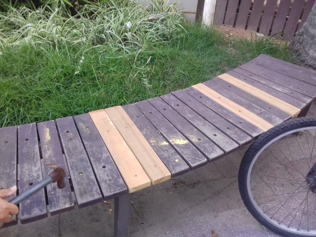 Também na Avenida Brasil, esquina com a Avenida Alvim Bauer, bancos de madeira foram consertados pela equipe. No local, houve a reposição de algumas ripas do assento, que estavam faltando.