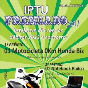 Bela iniciativa do prefeito de Santa Cecilia Nuno Scariot em lançar o IPTU premiado. Para os contribuintes que pagaram o seu IPTU à vista, já podem preencher o seu cupom na prefeitura. E para os que estão pagando parcelado, precisam quitar primeiro todas as parcelas, para depois ir até a prefeitura levar o carnê comprovando que quitou-as .O contribuinte para participar do sorteio precisa estar com o carnê quitado até o dia do sorteio.